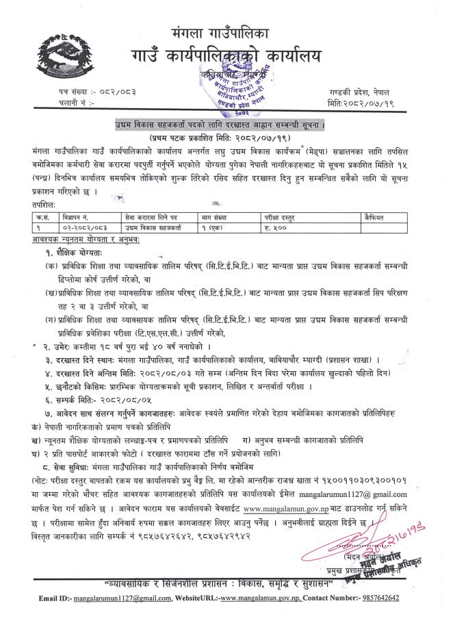 उद्यम विकास सहजकर्ता पदको लागि दरखास्त आह्वान सम्बन्धी सूचना ।