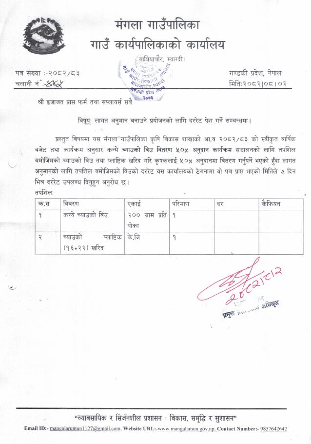 आ.व. २०८१/८२ मंगला गाउँपालिका दररेट