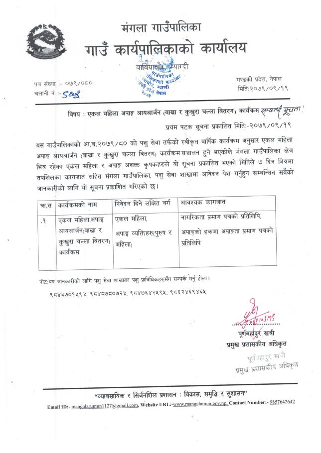 एकल महिला अपाङ्ग आयआर्जन (बाख्रा र कुखुरा चल्ला वितरण) कार्यक्रम सम्बन्धी सूचना !!!