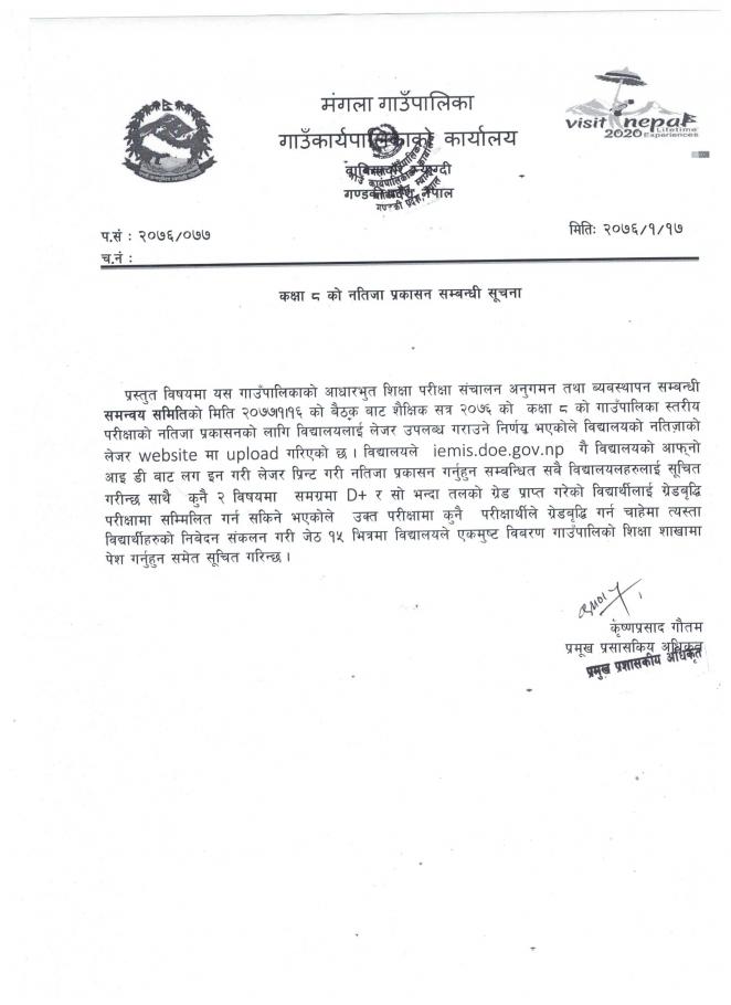 कक्षा ८ को नतिजा प्रकाशन सम्बधि सुचना ( श्री सबै विद्यालयहरु)
