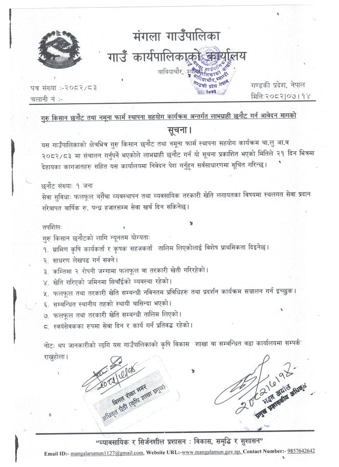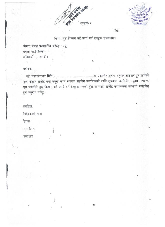 गुरु किसान भइ कार्य गर्न इच्छुक अगुवा कृषकहरुको लागि आवेदन पेश सम्बन्धी सूचना
