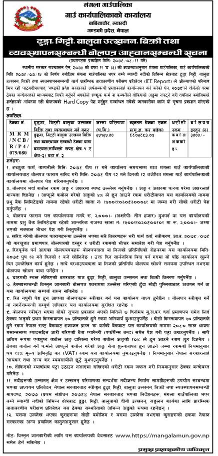 ढुङ्गा, गिट्टी, बालुवा उत्खनन, विक्री तथा व्यवस्थापन सम्बन्धी बोलपत्र आह्वान सम्बन्धी सूचना !!!