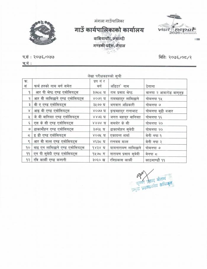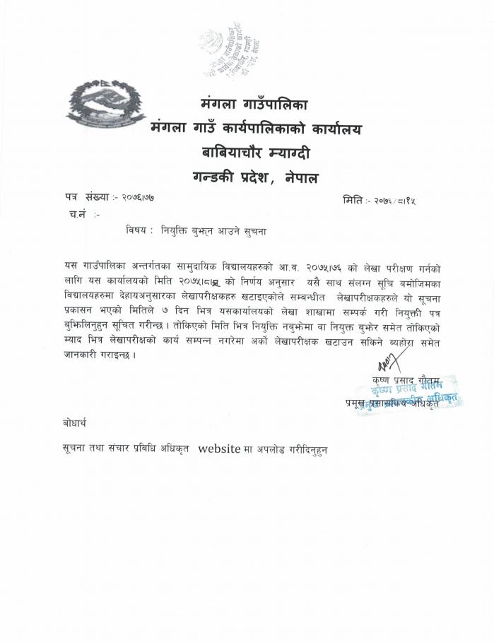 मंगला गाउँपालिकाका सामुदायिक विद्यालयहरुको लेखा परिक्षणका लागि लेखा परीक्षक नियुक्ति सम्बन्धी सूचना !!!