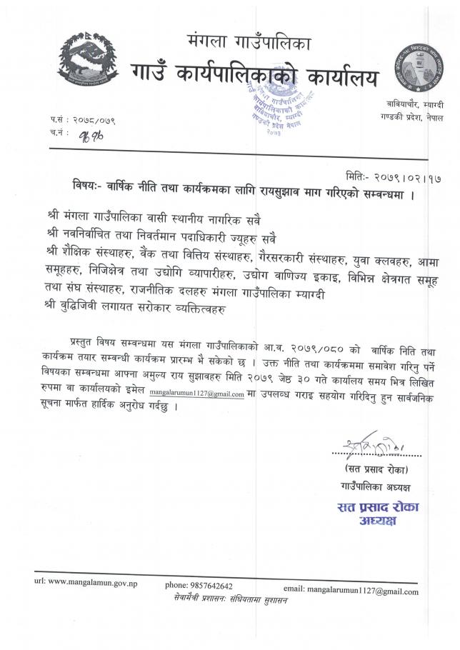 » वार्षिक नीति तथा कार्यक्रमका लागि रायसुझाव माग गरिएको सम्बन्धी सूचना !!!