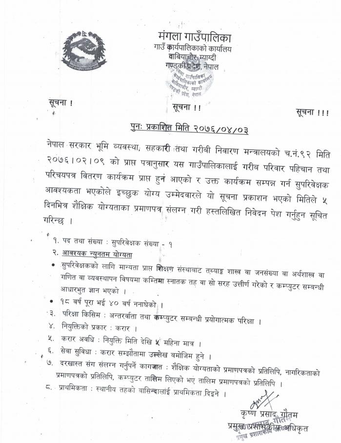 सुपरिवेक्षक पदको लागि पुन: आवेदन दिने सूचना प्रकाशन गरिएको सम्बन्धमा