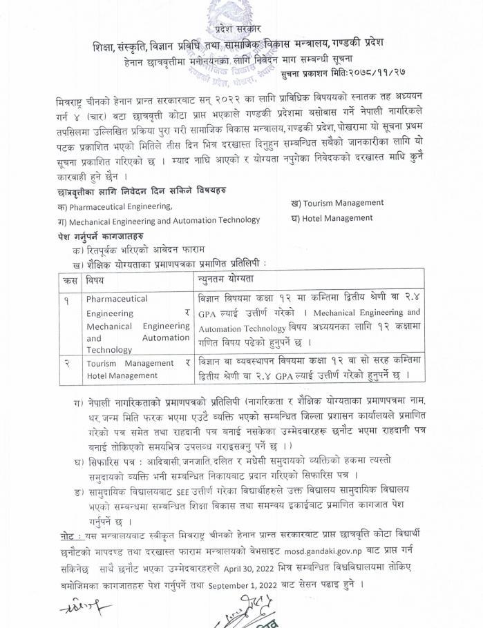 हेनान छत्रवृत्तीमा मनोनयनका लागि निवेदन माग सम्बन्धी सूचना !!!