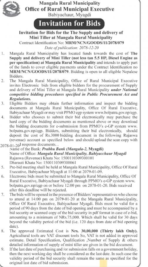 Invitation for Bids for the The Supply and delivery of Mini Tiller (MRM/NCN/GOODS/11/2078/079)